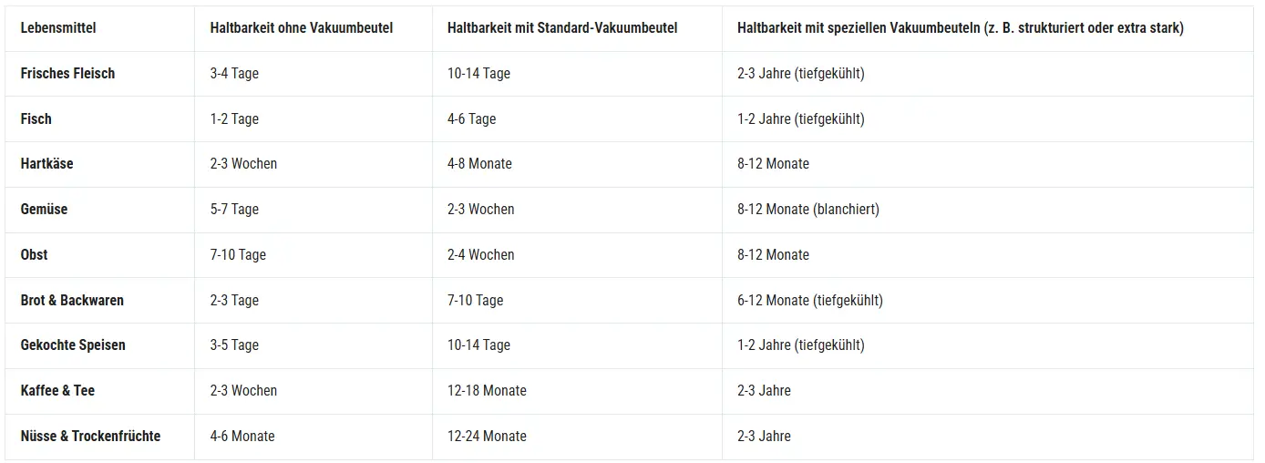 | Lebensmittel | Haltbarkeit ohne Vakuumbeutel | Haltbarkeit mit Standard-Vakuumbeutel | Haltbarkeit mit speziellen Vakuumbeuteln (z. B. strukturiert oder extra stark) |