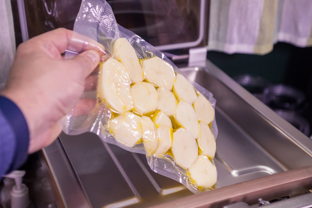 … eignen sich optimal zur Verwendung auf einem Vakuumierer mit Außenabsaugung. Die Pumpe des Gerätes kann durch die Goffrierung die gesamte Luft aus dem Beutel ziehen. Nutzt man mit einem solchen Gerät hingegen einen glatten Vakuumbeutel, geht diese Fähigkeit aufgrund der glatt aufeinander aufliegenden Lagen des Beutels verloren. Es entsteht kein Vakuum.