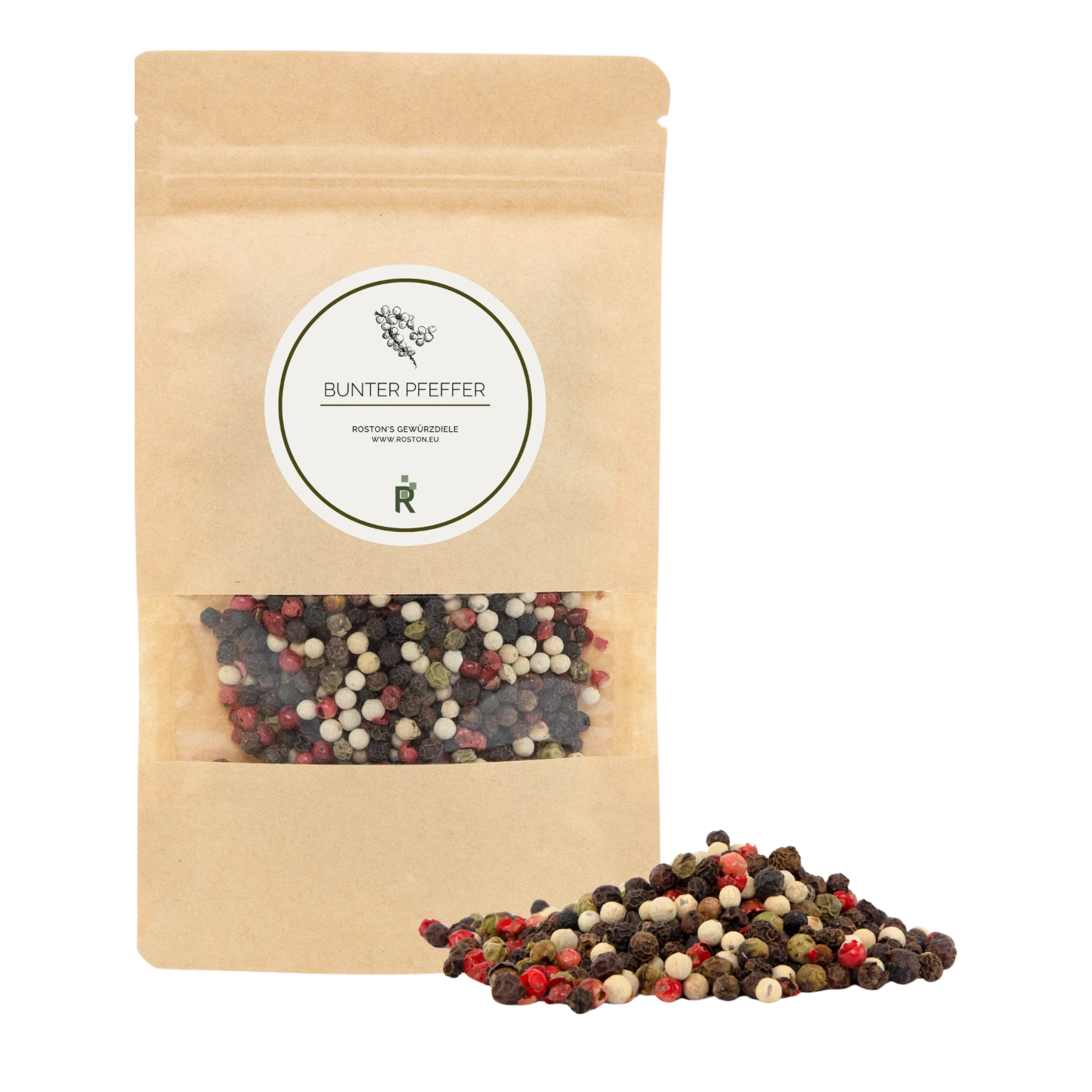 Bunter Pfeffer ist Bestandteil fast aller Esskulturen weltweit. Vier verschiedene Pfeffersorten vereinen sich dabei und geben somit eine ganz Besondere Nuance. Er eignet sich speziell zum Würzen von Fleisch, Gemüse und Fischgerichten. Zudem ist dieser Grundlage verschiedener Soßen und Suppen.
