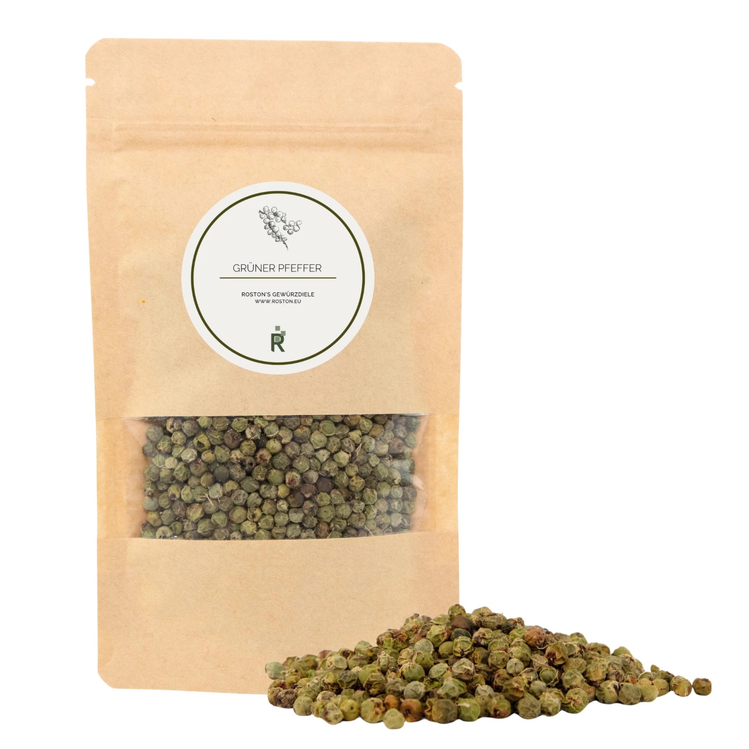 Grüner Pfeffer ist für sein mild-pfeffriges Aroma bekannt. Die kleinen grünen Körner haben eine leichte Schärfe. Die werden gerne für Pfeffersoßen genutzt, da die Körner durch das Kochen weich werden und somit genießbar sind. Er schmeckt hervorragend zu Thai-Gerichten, außerdem zu Wild, Ente, Käse, Terrinen, Rindersteak und sämtlichen Sahnesoßen.
