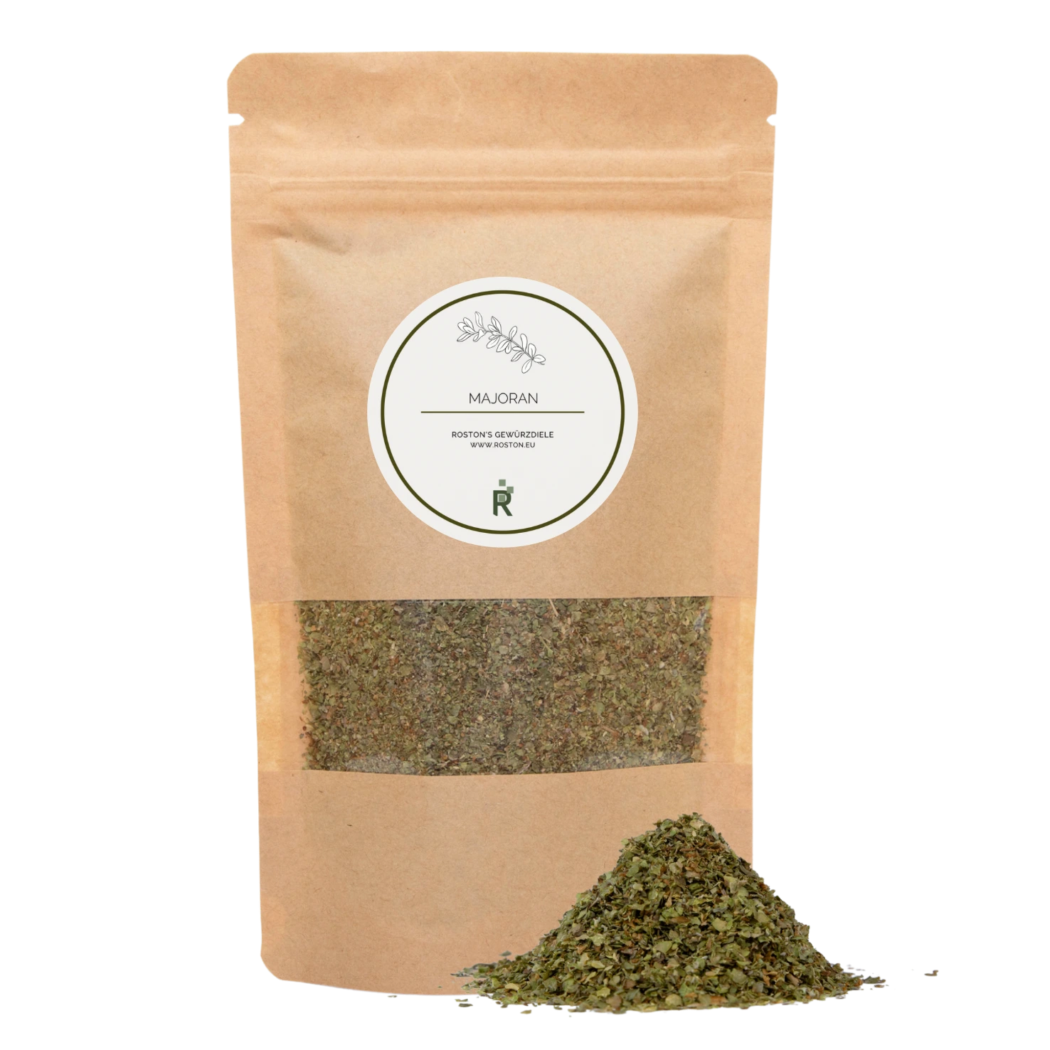 Dieses Produkt besteht aus getrockneten Majoranblättern, die im Durchschnitt 2-4mm groß sind. Majoran ist Bestandteil vieler Esskulturen weltweit. Er besitzt ein süßlich würziges Aroma und einen leicht scharfen Geschmack. Des Weiteren werden viele deutsche Wurstwaren damit gewürzt. Er eignet sich gut zu Schweine-, Rinder- und Wildbraten, sowie deftigen Gemüsegerichten, wie Linseneintöpfen oder Bratkartoffeln. Zudem ist Majoran Grundlage verschiedener Soßen und Suppen. Er kann als Ersatz für das frische Produkt genutzt werden.